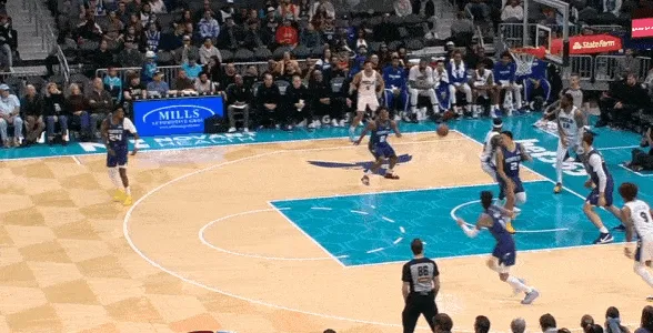 米勒对位上线的马克西因此获得快攻最前线的天然身位优势,随后和快速推进的三球获得前场2打1的优势局面。米勒右路跟进切入篮下,接三球高吊传球直接空接隔扣马克西。